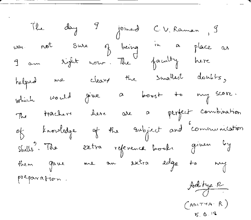As a whole, my experience at CV Raman academy has really been a delightful and fruitful one at the same time. I strongly recommend students to join CV Raman Academy and benefit from them. Thank you!
